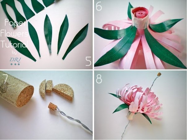ابتدا کاغذ مخصوص گلبرگ را به صورت تیره و روشن رنگ آمیزی کرده و سپس برش های منظم مانند شکل می دهیم.حالا رشته های کاغذ را کمی حالت می دهیمو سپس آن را از یک طرف لوله می کنیم ودر پایان با چسب کاغذی محکم کرده و کاسبرگ و ساقه را به آن متصل و با نوا گاترین یا کاغذ کشی سبز روی ساقه و انتهای گل را می پوشانیم.